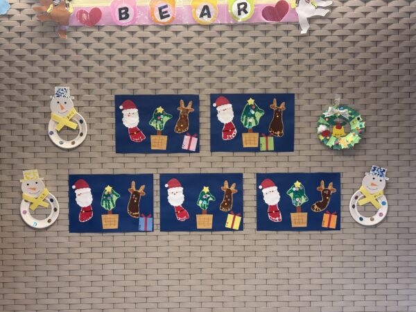壁面では、指スタンプとシールで雪だるまを作ったり、手形・足形でサンタさんやトナカイさん、ツリーを作ってみたり、画用紙をたくさん貼り付けてポンポンの飾りもいっぱい貼って作ったリースなど各々クリスマスを楽しみにしながら作れました♪