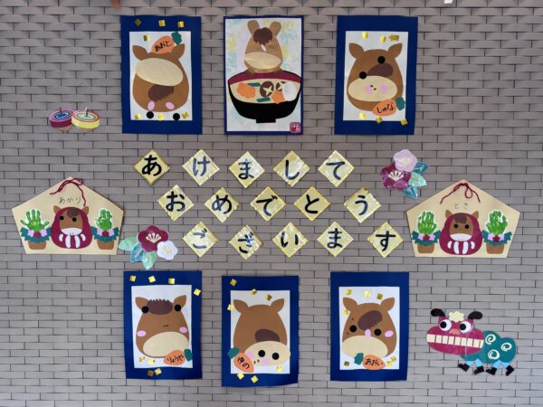 新年最初の壁面製作は…午年にちなんで「うまとお雑煮」「うまの福笑い」「うまダルマと門松」を各学年作りました!